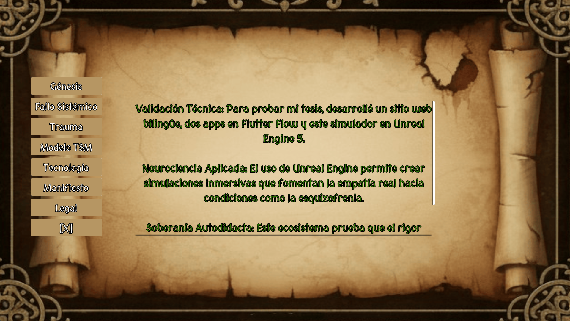 La misión de nuestro fundador se centra en la gestión de proyectos humanitarios para los sectores más vulnerables. Al integrar un marco teórico propio —fruto de años de Investigación Estratégica Avanzada— hemos convertido a Unreal Engine 5 en una herramienta de cambio social. Creemos que para que la salud mental sea realmente accesible, la tecnología debe hacer el esfuerzo de innovar con empatía.